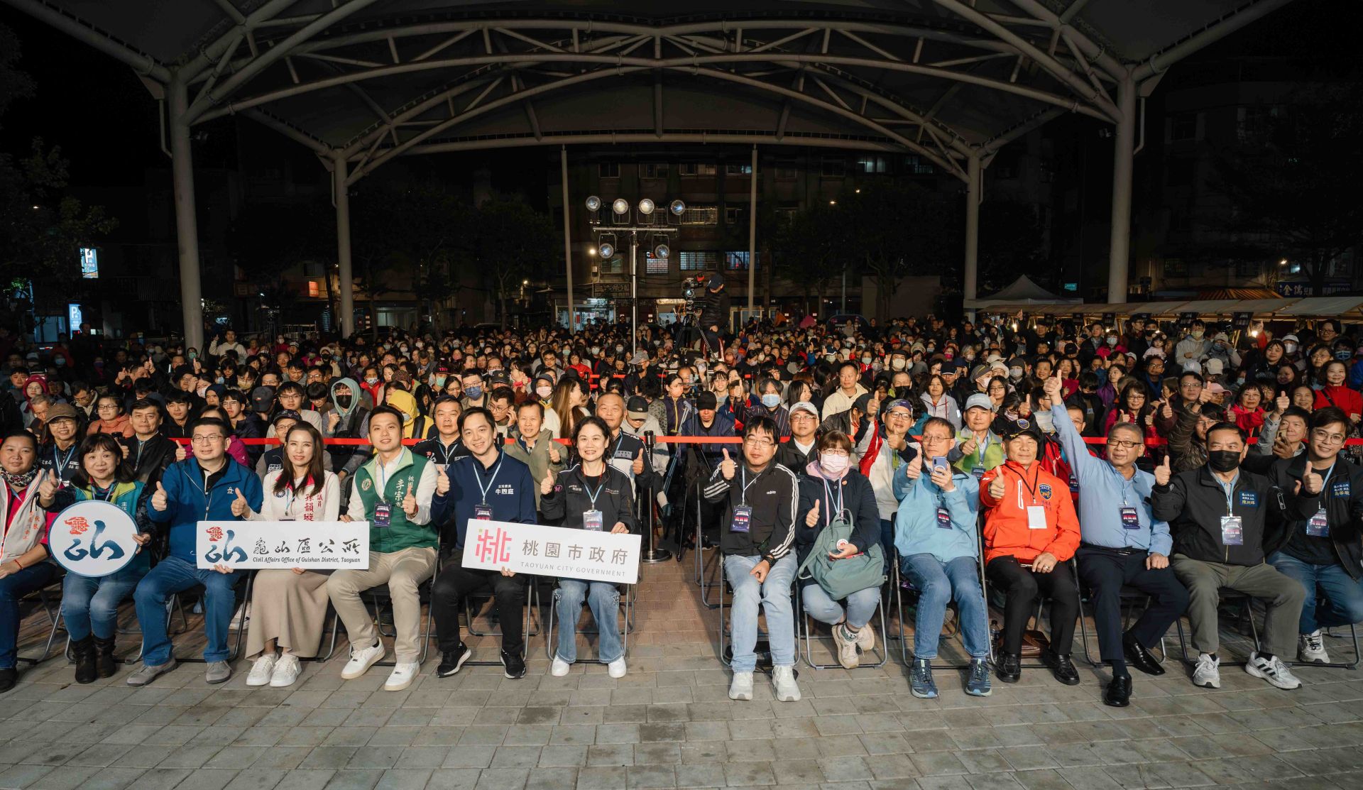 ▲融合在地特色與流行文化的跨世代音樂會-「2025龜山楓茶米.野Fun音樂會」,現場人氣爆棚,吸引近千名市民朋友參加。桃園市政府副秘書長賴淑華(前排左7)和與會貴賓及現場熱情民眾合影。(圖/桃園市龜山區公所提供)
