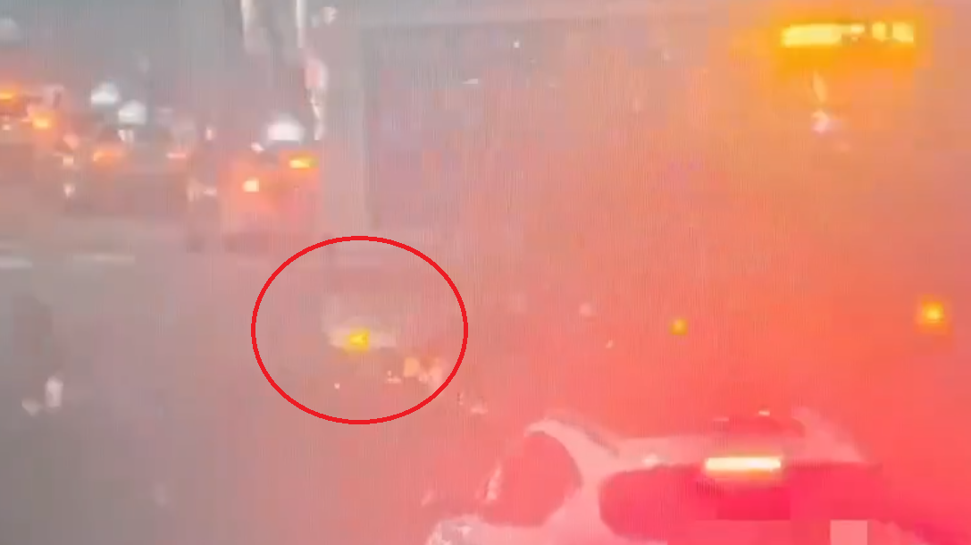 機車失控打滑撞公車(紅圈處)。翻攝畫面