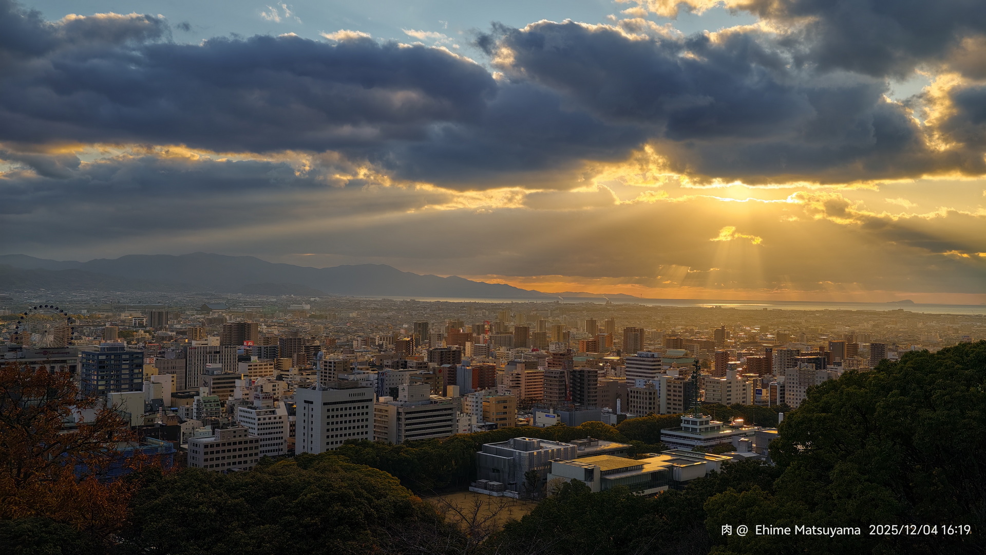 ▲站在松山的高處眺望,厚重的雲層擋不住午後的陽光。一道道光束如瀑布般傾瀉而下,將松山市與遠方的瀨戶內海染上一層神聖的金黃色。/ 肉哥 攝