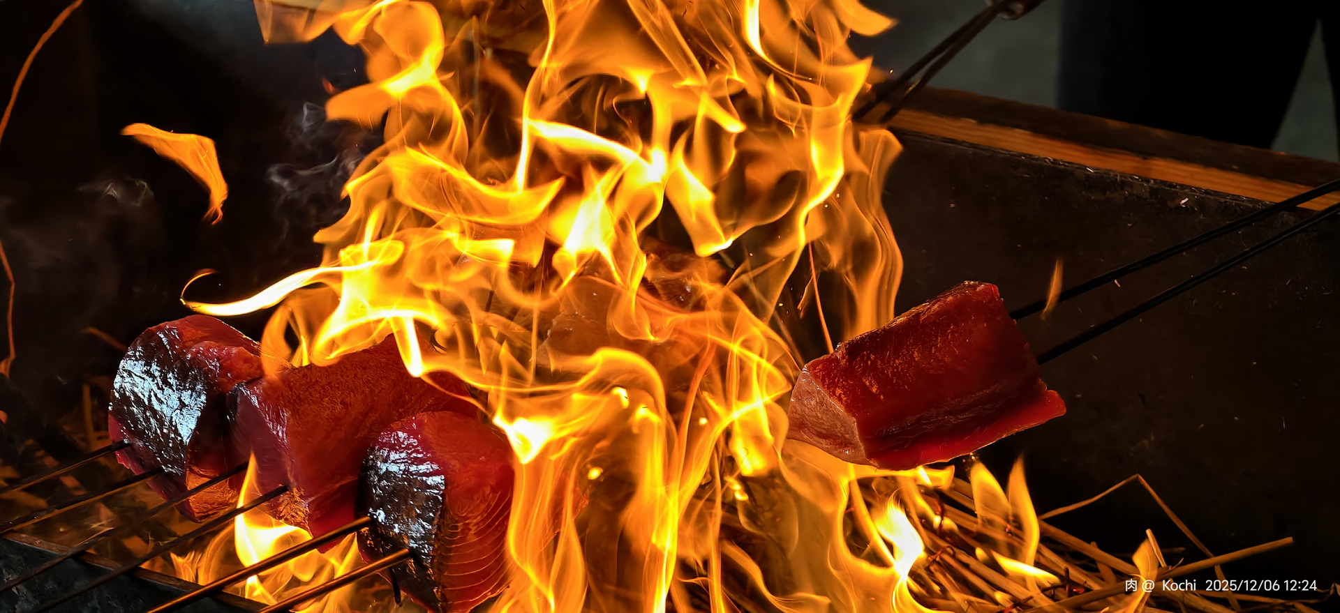 炙燒鰹魚時,火焰猛然竄起,油脂的香氣在空氣裡炸開。