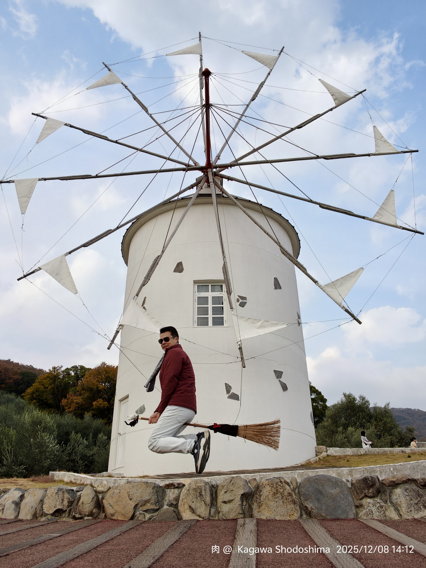 ▲香川小豆島橄欖公園,遊客騎掃帚與白色風車重現魔女宅急便/ 肉哥 攝