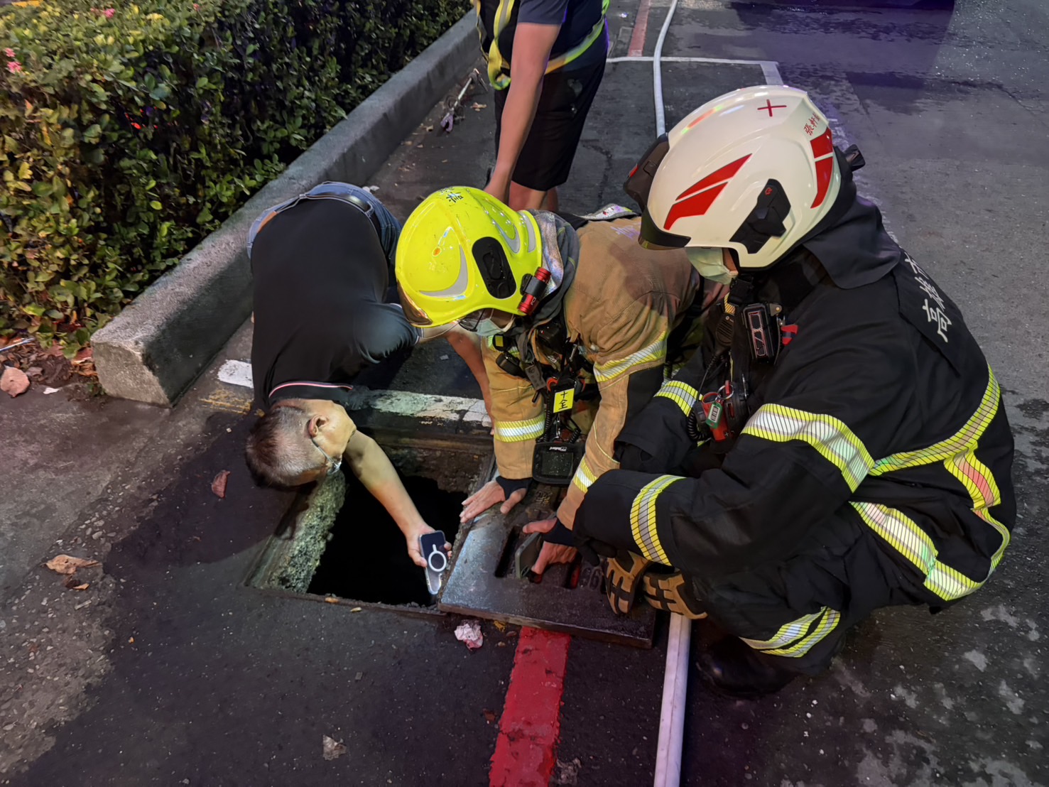 高雄三民區中華三路、河北一路口今(1)日晚間6時許,傳出狀況,警消獲報後派遣3車7人趕赴,發現水溝蓋冒出白煙,立即使用氣體偵測器數值為0,疑似是台電線路出狀況,仍有待進一步釐清。